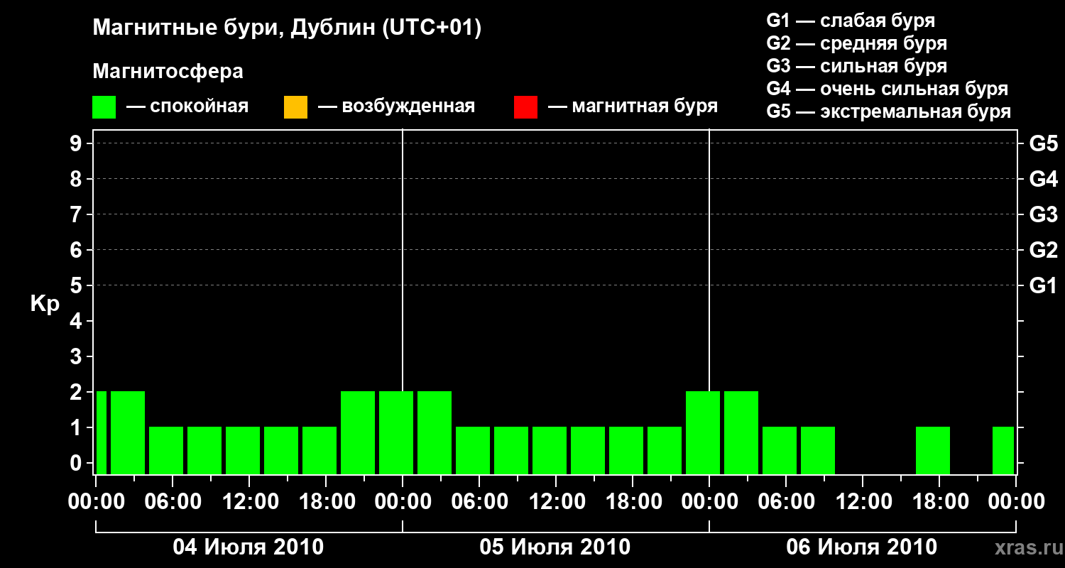 Изменения геомагнитного индекса Kp с 4 по 6 июля 2010 года для средних широт
