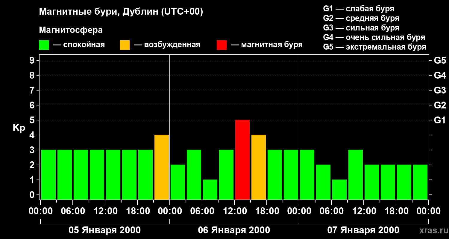 Изменения геомагнитного индекса Kp с 5 по 7 января 2000 года для средних широт