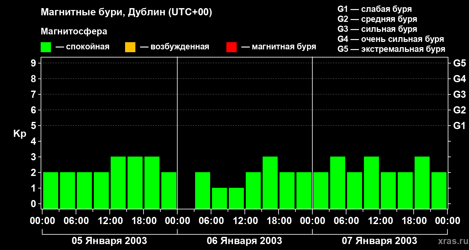 Изменения геомагнитного индекса Kp с 5 по 7 января 2003 года для средних широт