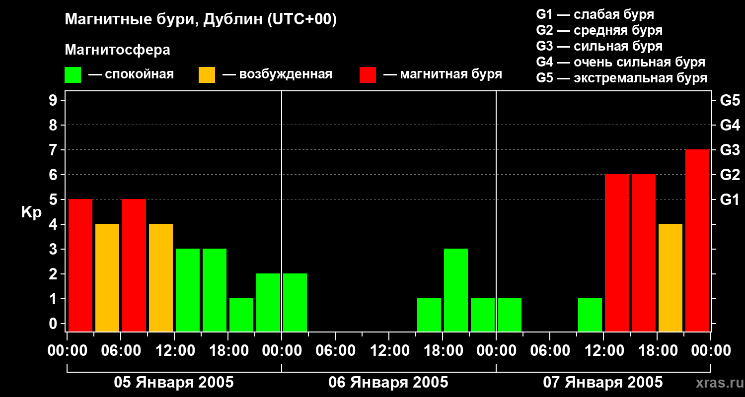Изменения геомагнитного индекса Kp с 5 по 7 января 2005 года для средних широт