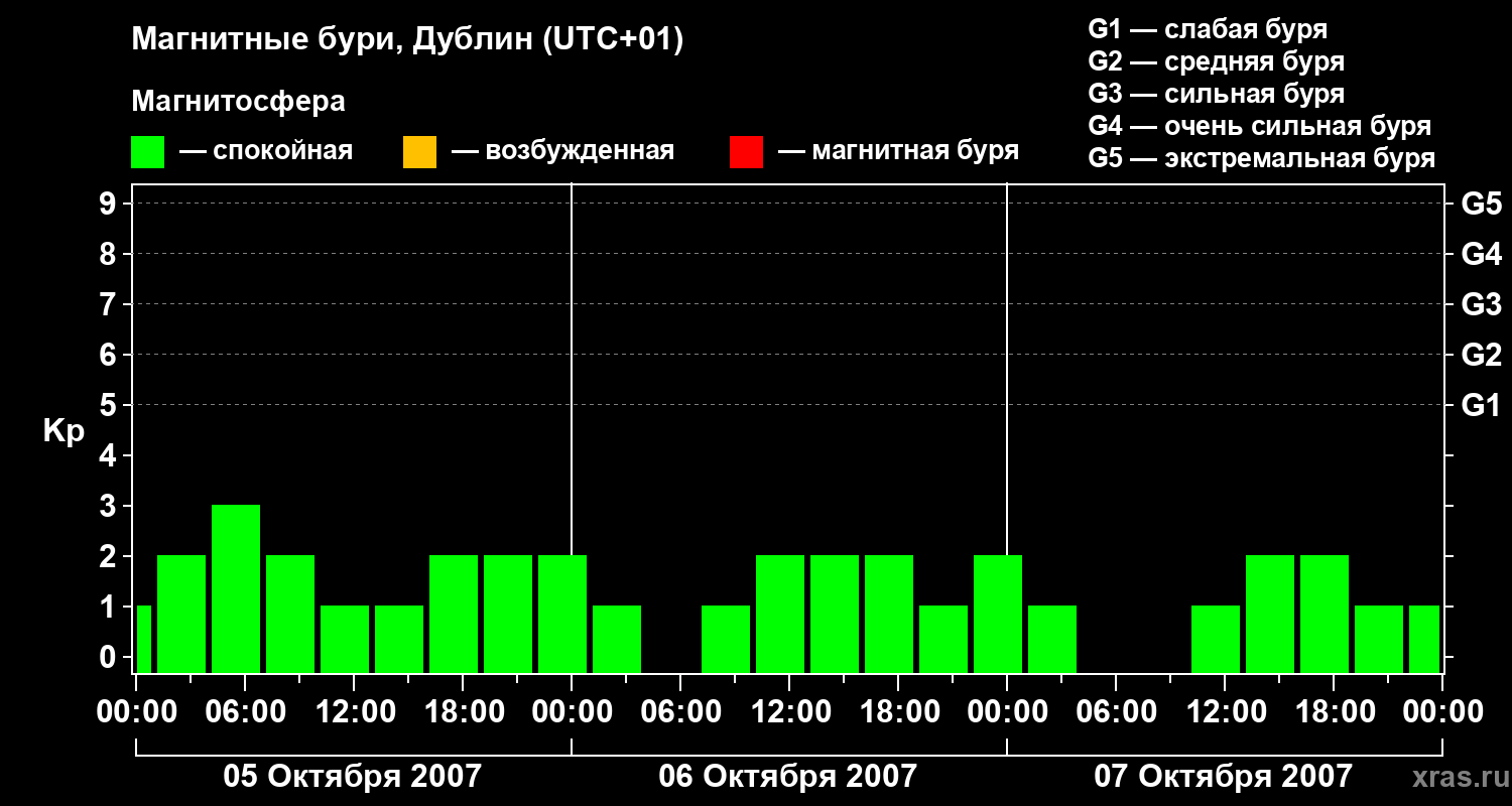 Изменения геомагнитного индекса Kp с 5 по 7 октября 2007 года для средних широт