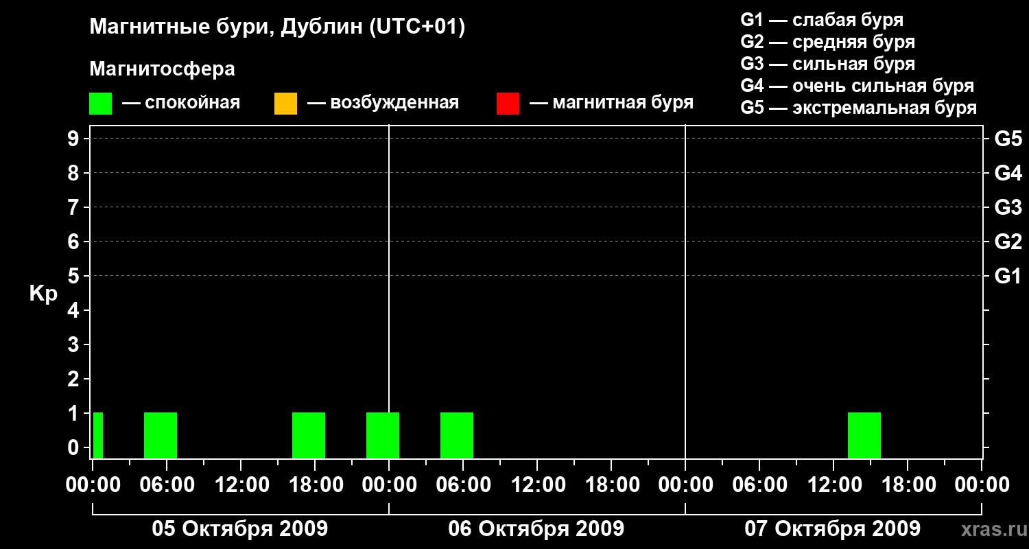 Изменения геомагнитного индекса Kp с 5 по 7 октября 2009 года для средних широт