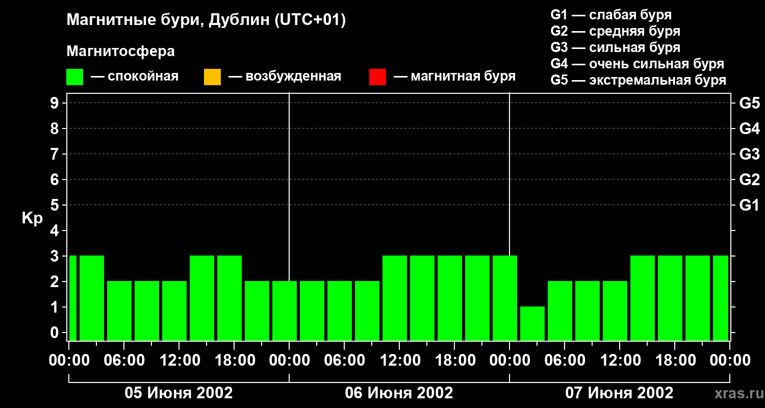 Изменения геомагнитного индекса Kp с 5 по 7 июня 2002 года для средних широт