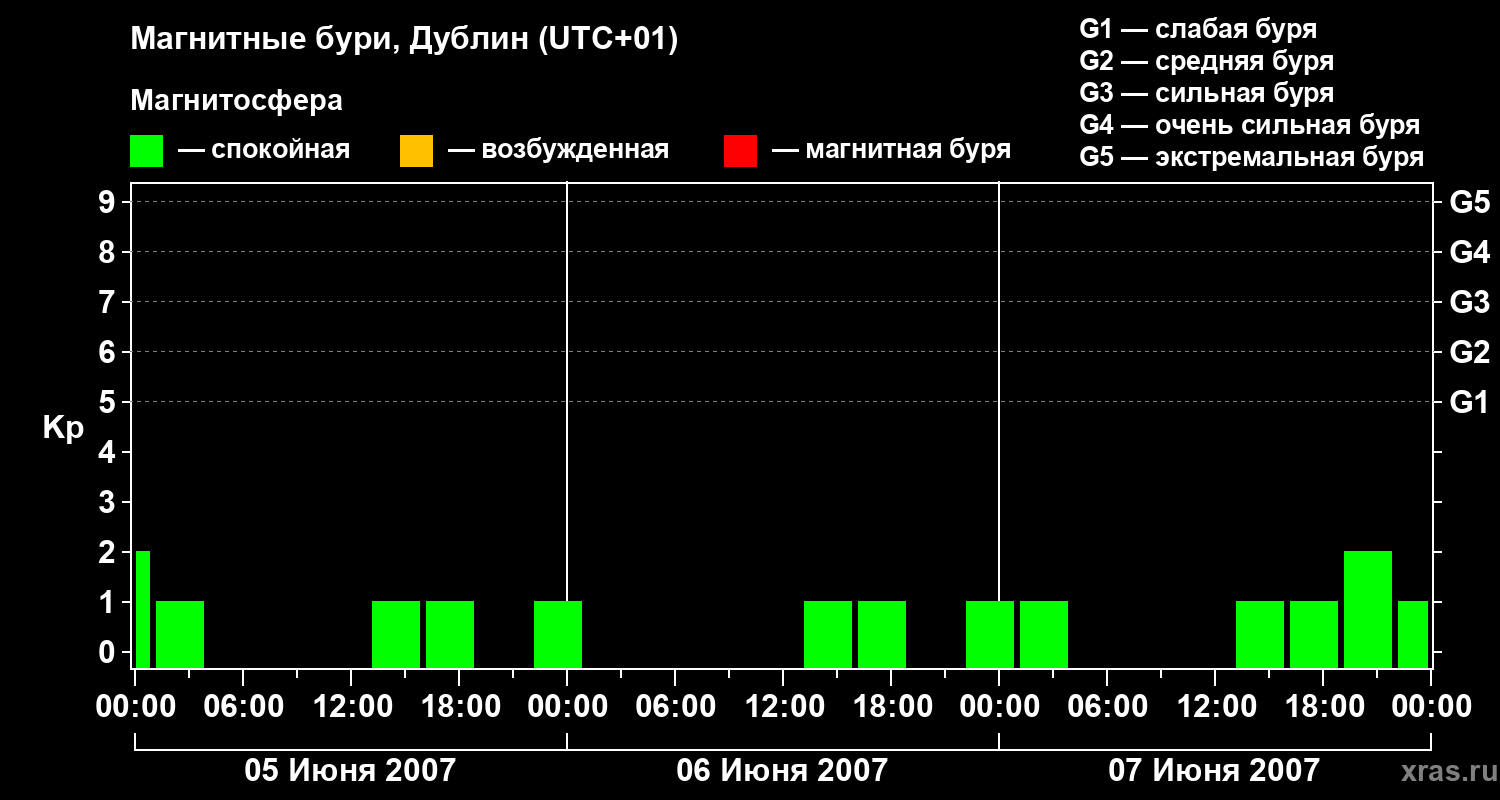 Изменения геомагнитного индекса Kp с 5 по 7 июня 2007 года для средних широт