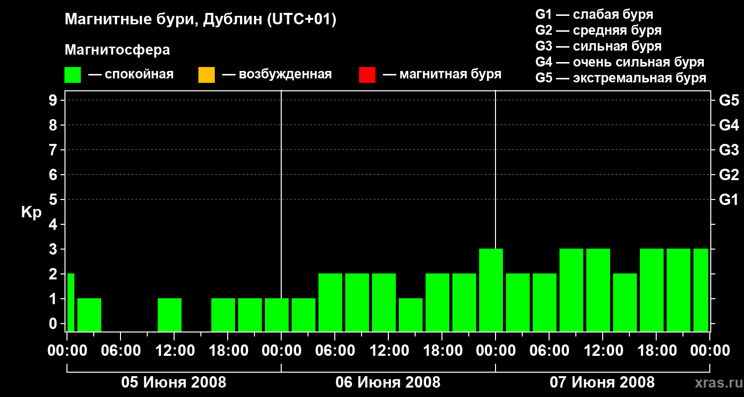 Изменения геомагнитного индекса Kp с 5 по 7 июня 2008 года для средних широт