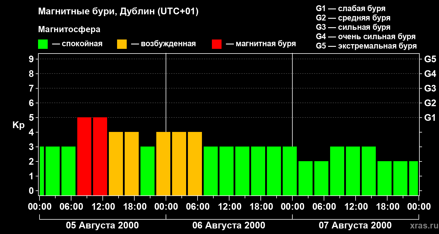 Изменения геомагнитного индекса Kp с 5 по 7 августа 2000 года для средних широт