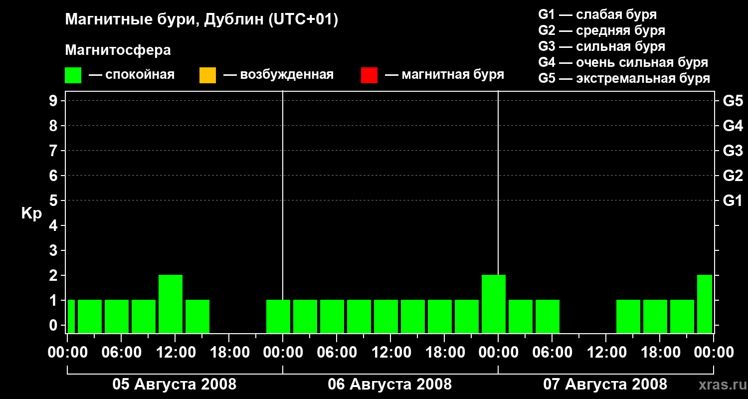 Изменения геомагнитного индекса Kp с 5 по 7 августа 2008 года для средних широт