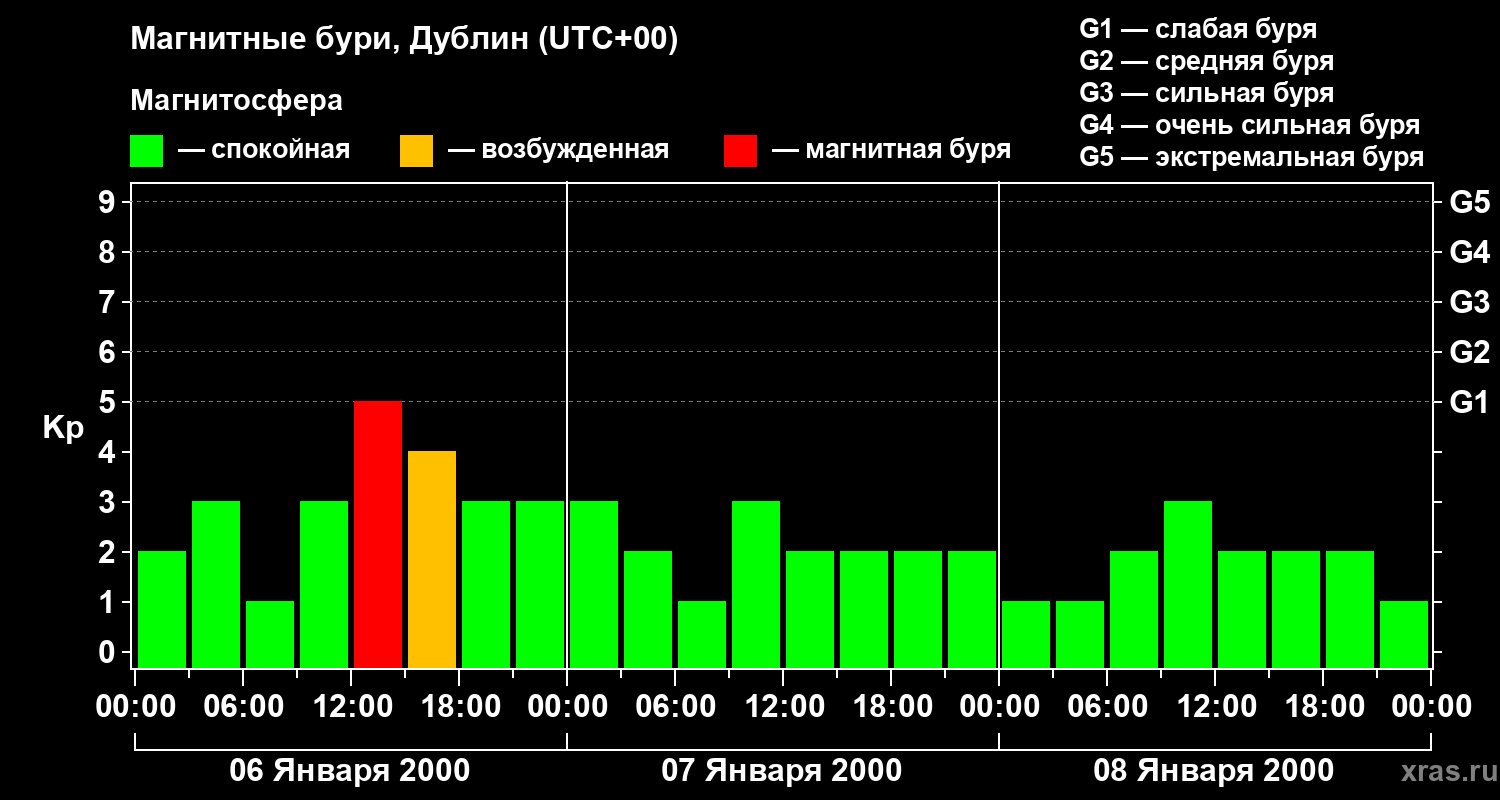 Изменения геомагнитного индекса Kp с 6 по 8 января 2000 года для средних широт