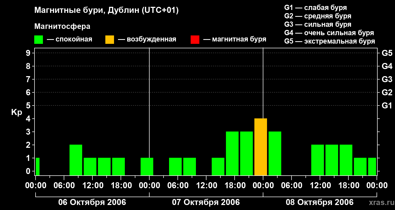 Изменения геомагнитного индекса Kp с 6 по 8 октября 2006 года для средних широт