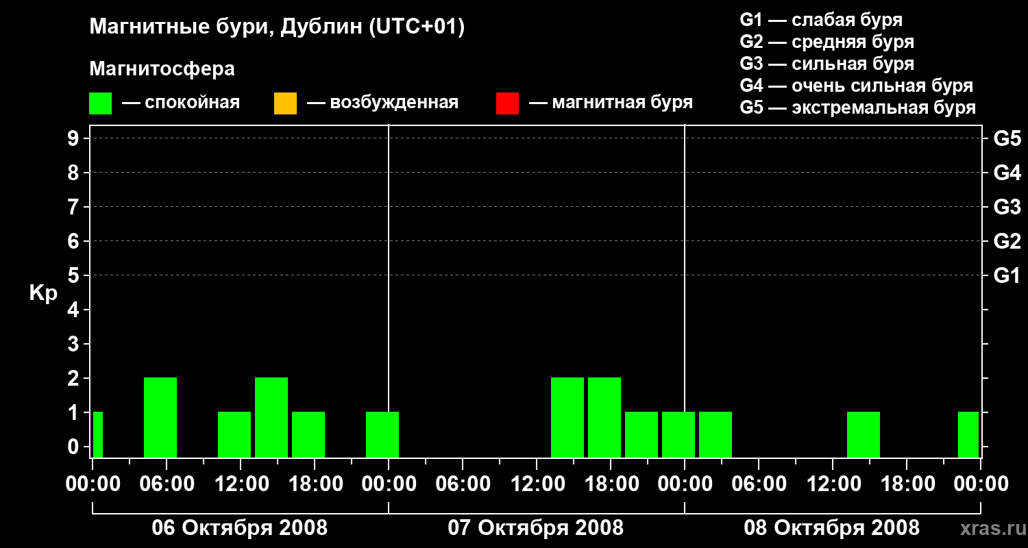 Изменения геомагнитного индекса Kp с 6 по 8 октября 2008 года для средних широт