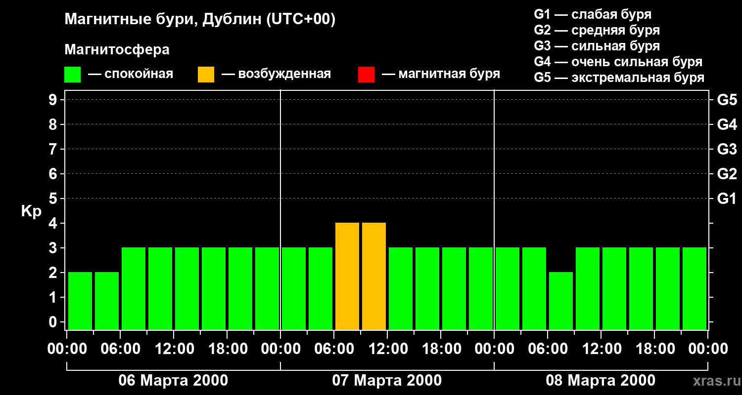 Изменения геомагнитного индекса Kp с 6 по 8 марта 2000 года для средних широт