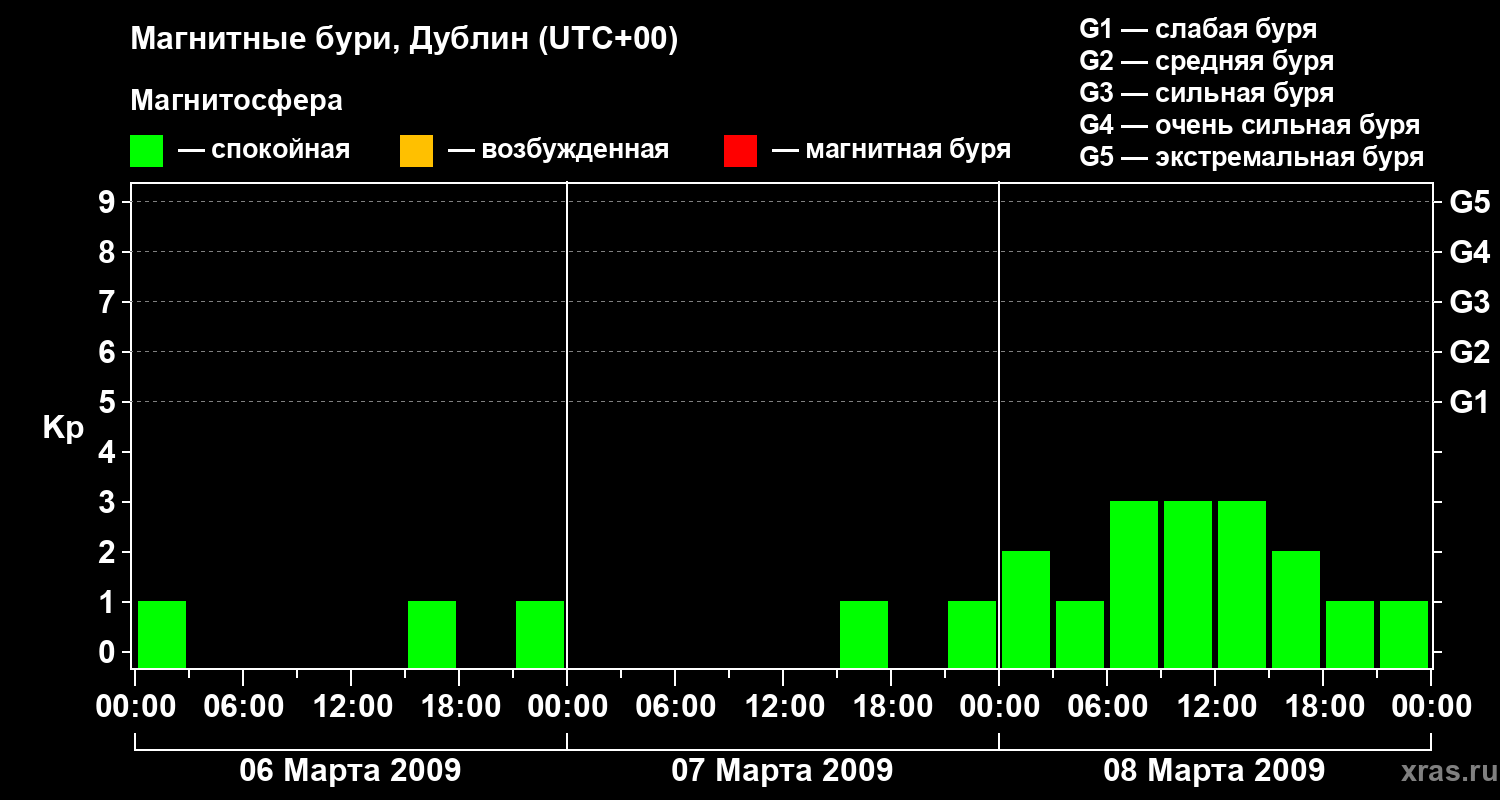 Изменения геомагнитного индекса Kp с 6 по 8 марта 2009 года для средних широт