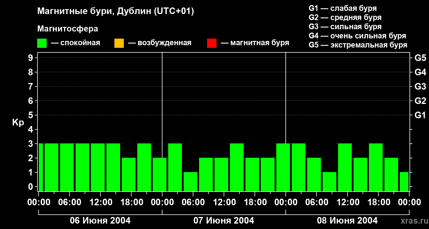 Изменения геомагнитного индекса Kp с 6 по 8 июня 2004 года для средних широт