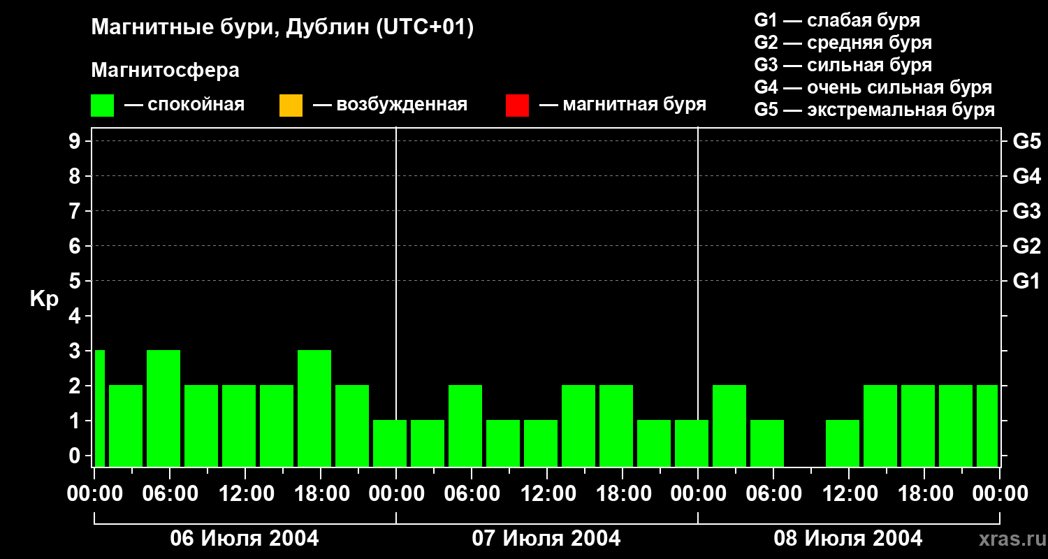 Изменения геомагнитного индекса Kp с 6 по 8 июля 2004 года для средних широт