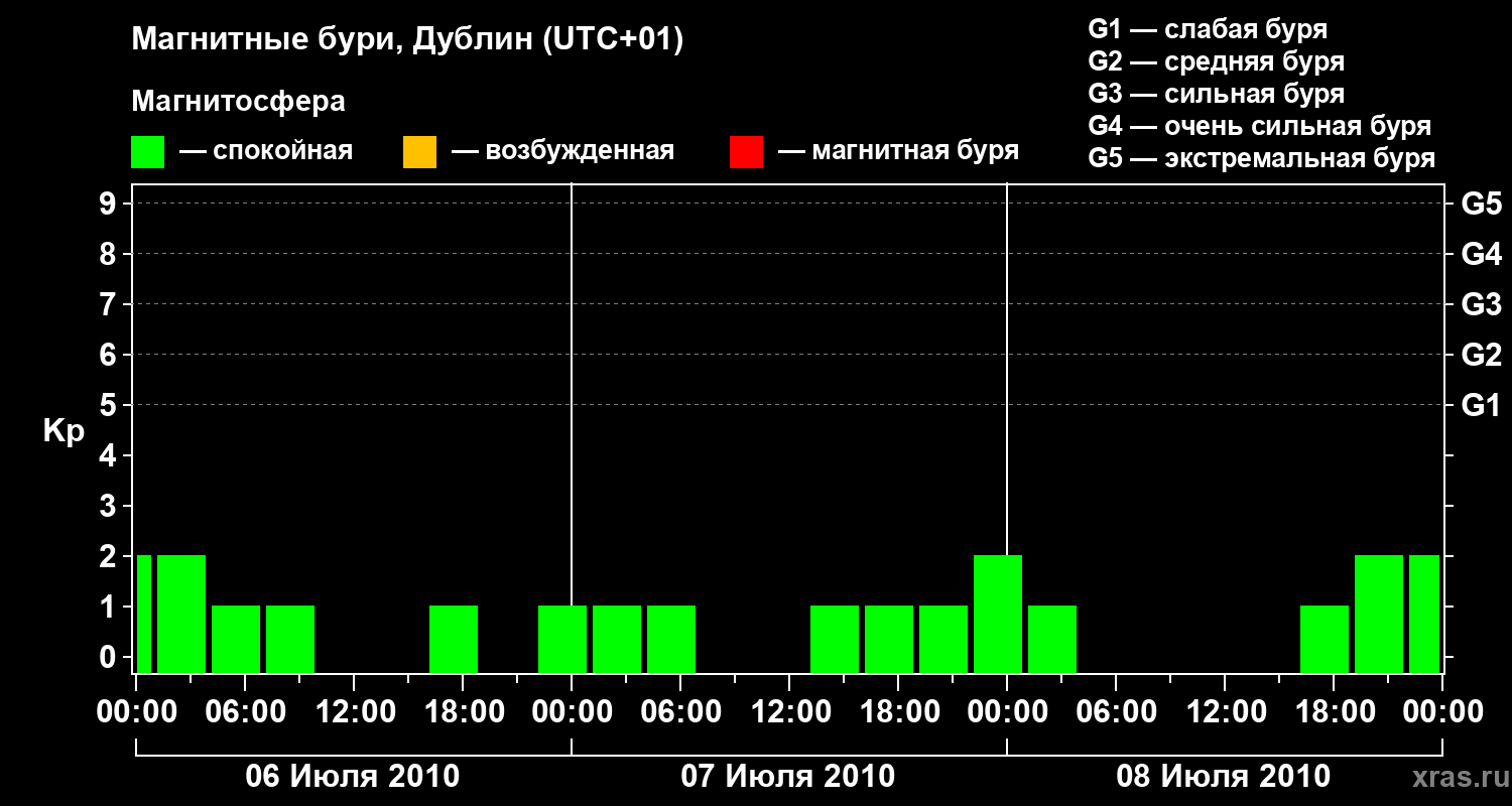 Изменения геомагнитного индекса Kp с 6 по 8 июля 2010 года для средних широт