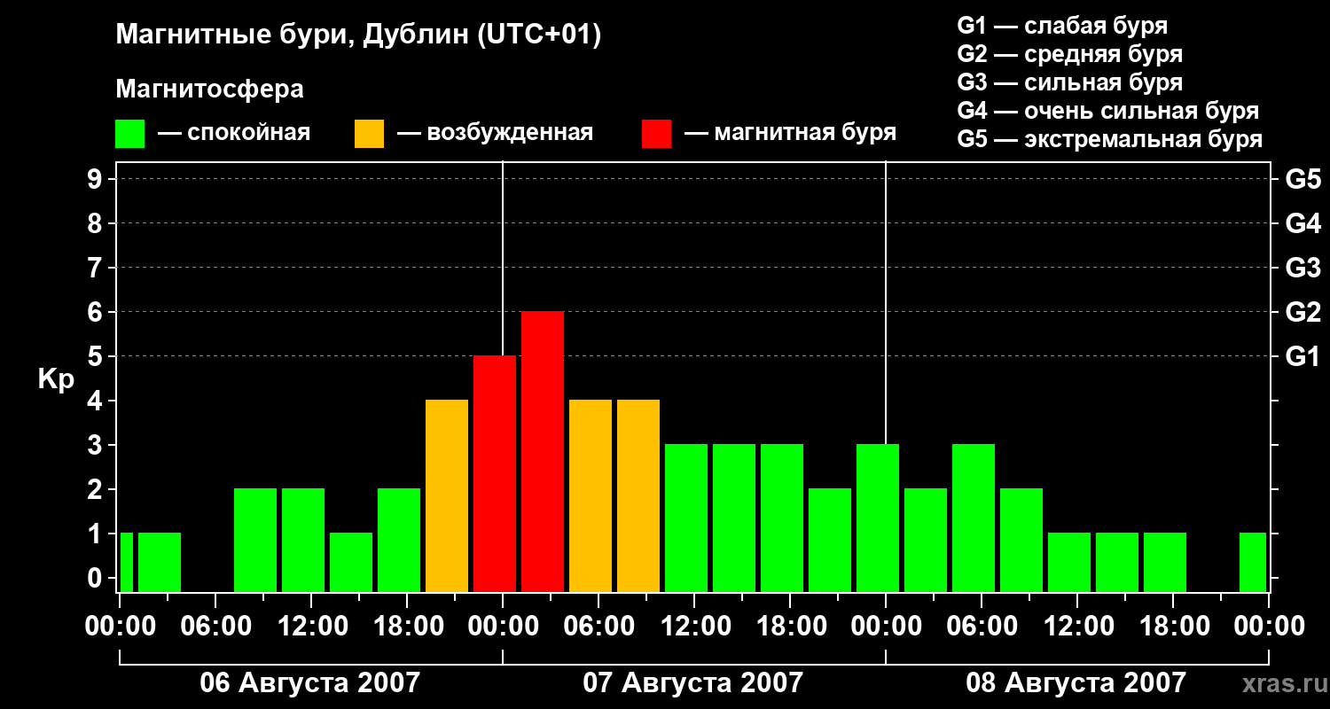 Изменения геомагнитного индекса Kp с 6 по 8 августа 2007 года для средних широт