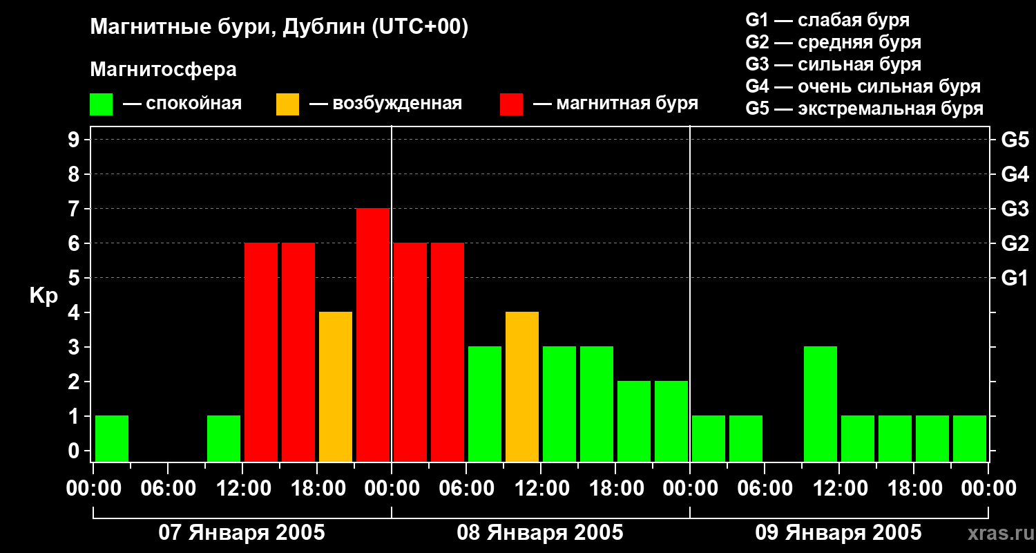 Изменения геомагнитного индекса Kp с 7 по 9 января 2005 года для средних широт