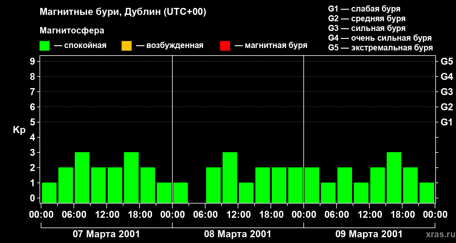Изменения геомагнитного индекса Kp с 7 по 9 марта 2001 года для средних широт