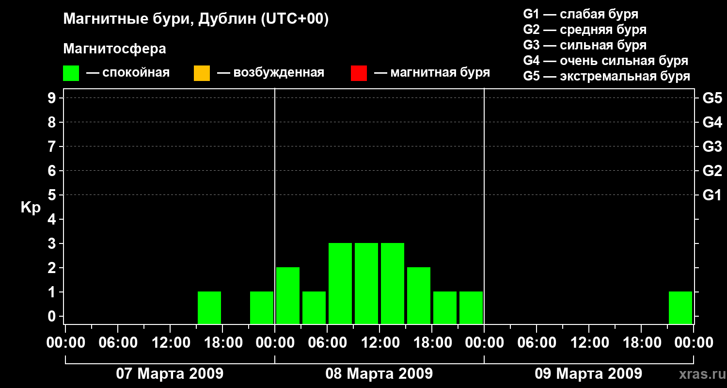 Изменения геомагнитного индекса Kp с 7 по 9 марта 2009 года для средних широт