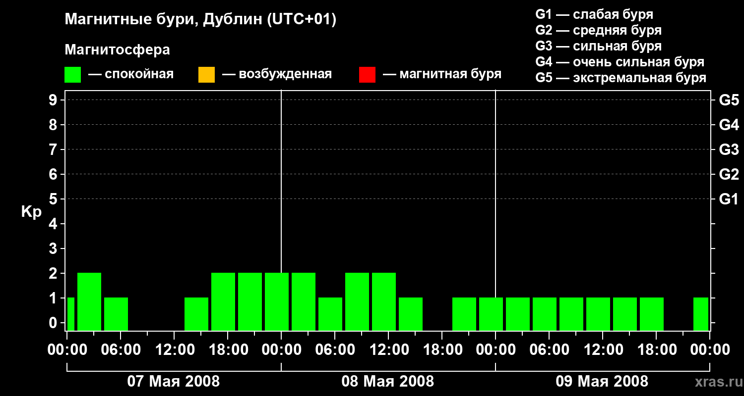 Изменения геомагнитного индекса Kp с 7 по 9 мая 2008 года для средних широт