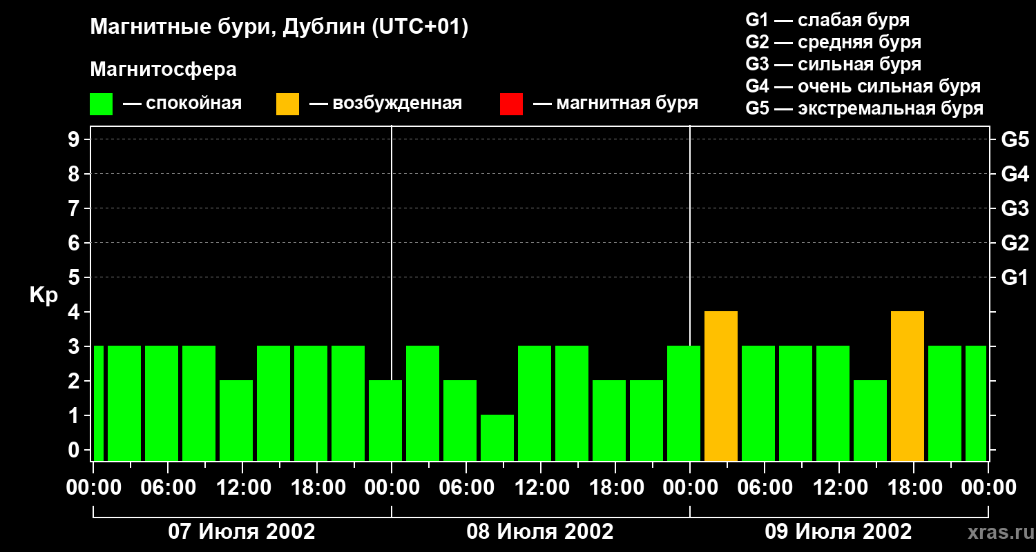 Изменения геомагнитного индекса Kp с 7 по 9 июля 2002 года для средних широт