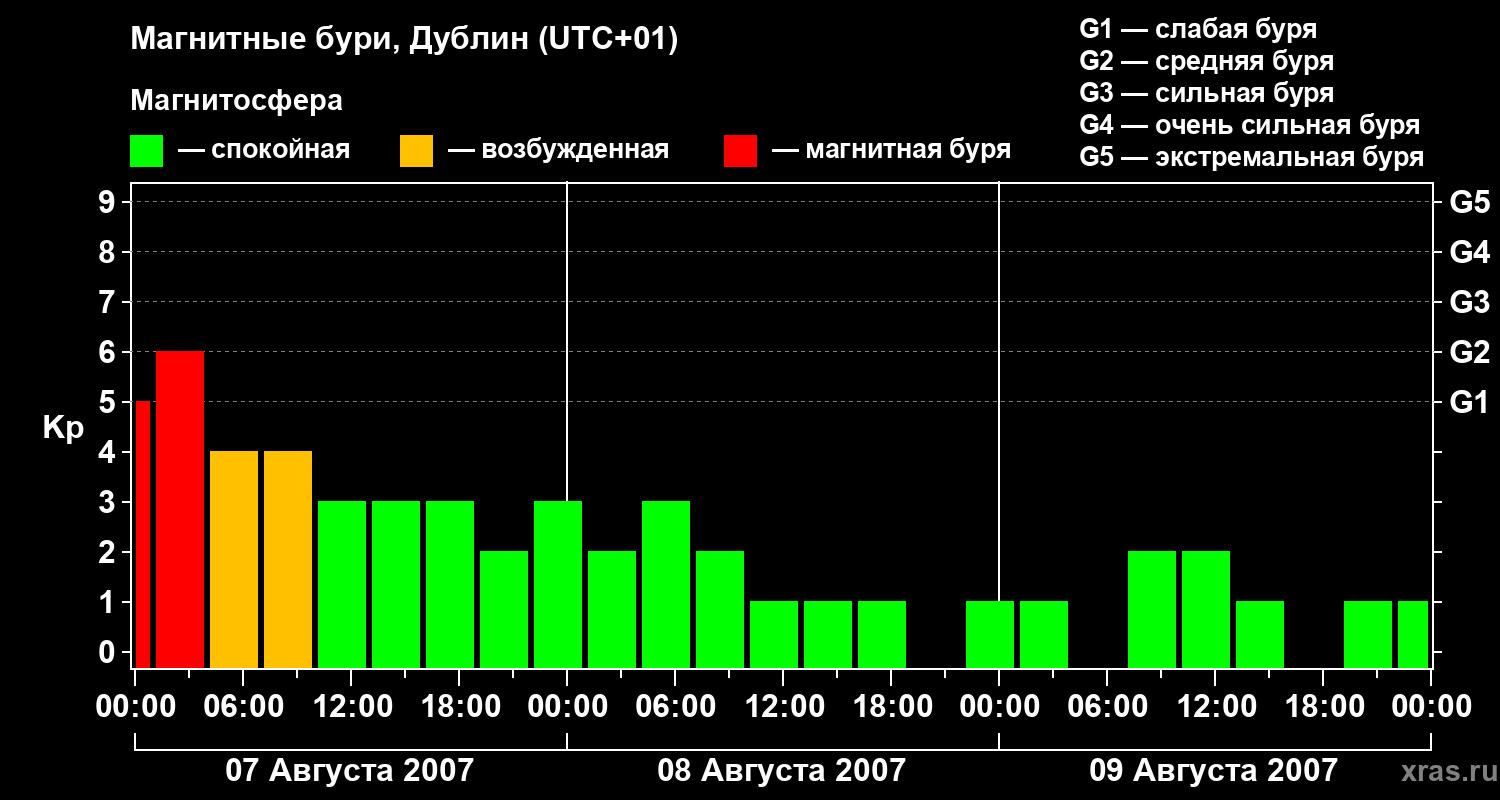 Изменения геомагнитного индекса Kp с 7 по 9 августа 2007 года для средних широт