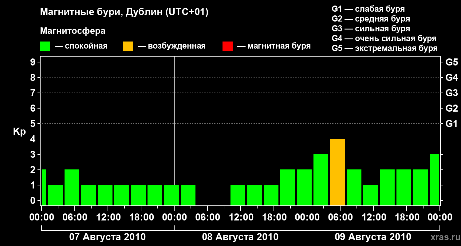 Изменения геомагнитного индекса Kp с 7 по 9 августа 2010 года для средних широт