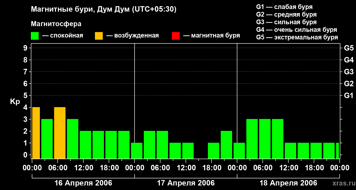 Изменения геомагнитного индекса Kp с 16 по 18 апреля 2006 года для средних широт