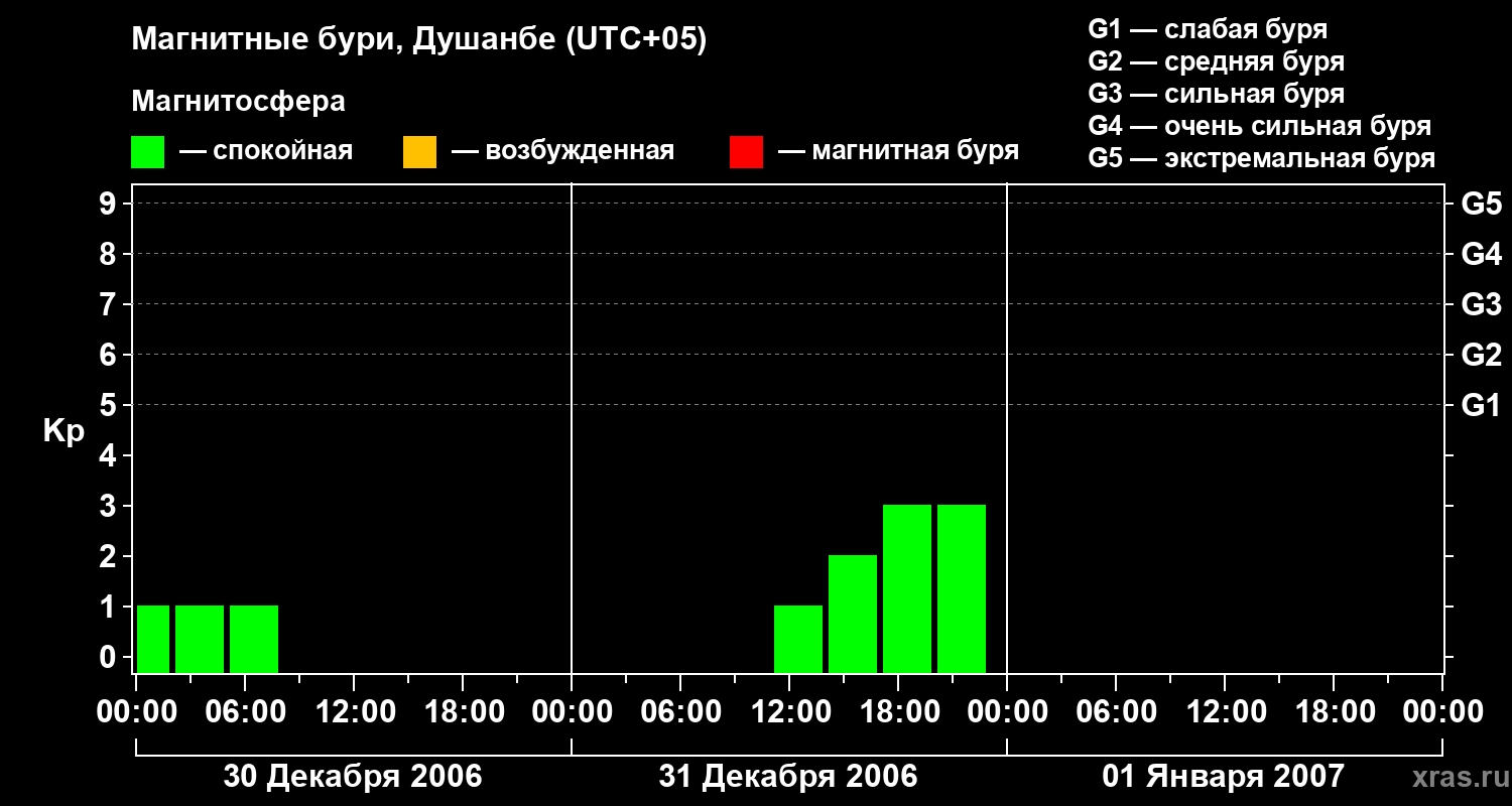 Изменения геомагнитного индекса Kp с 30 декабря 2006 года по 1 января 2007 года для средних широт