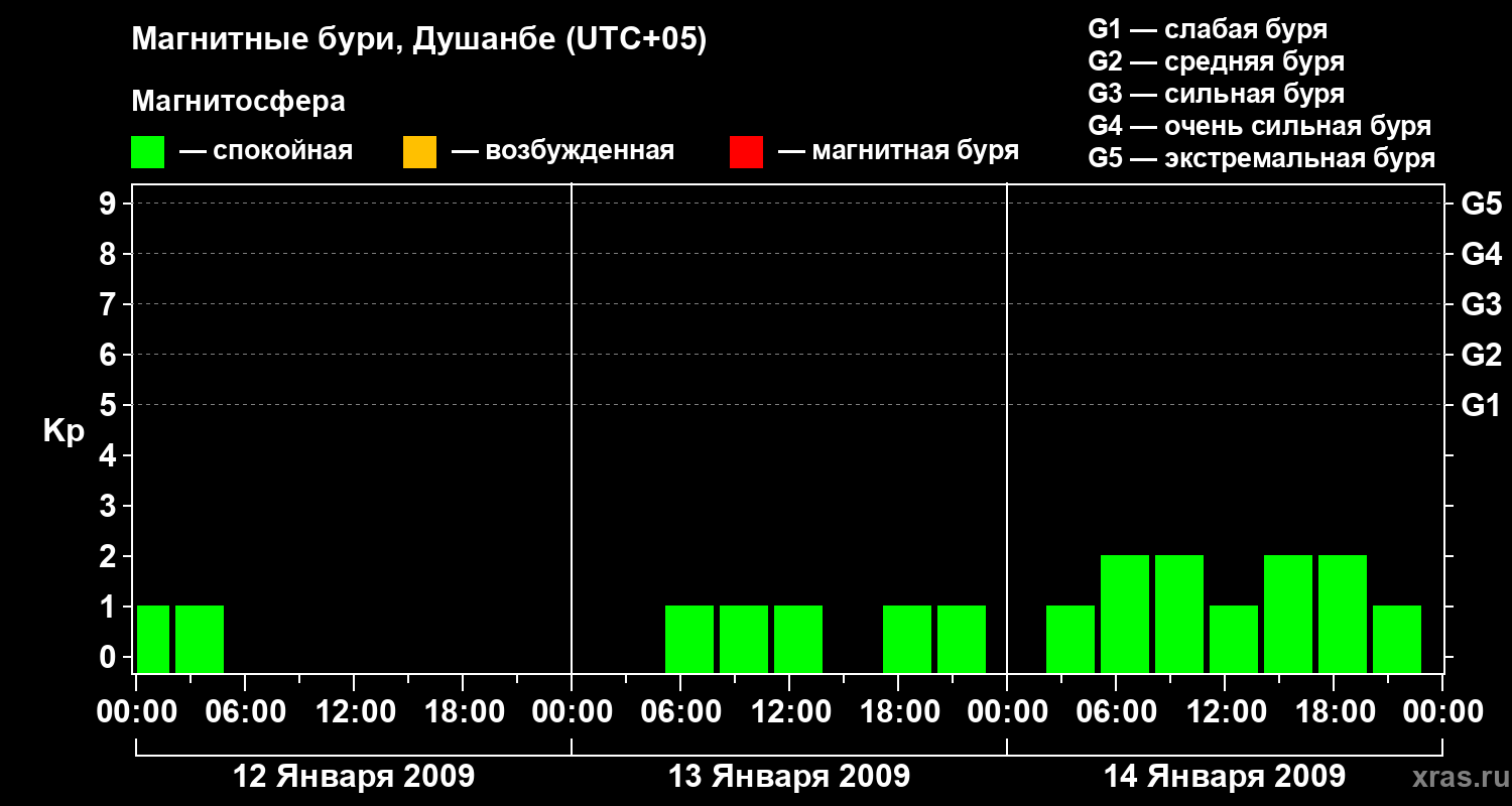 Изменения геомагнитного индекса Kp с 12 по 14 января 2009 года для средних широт