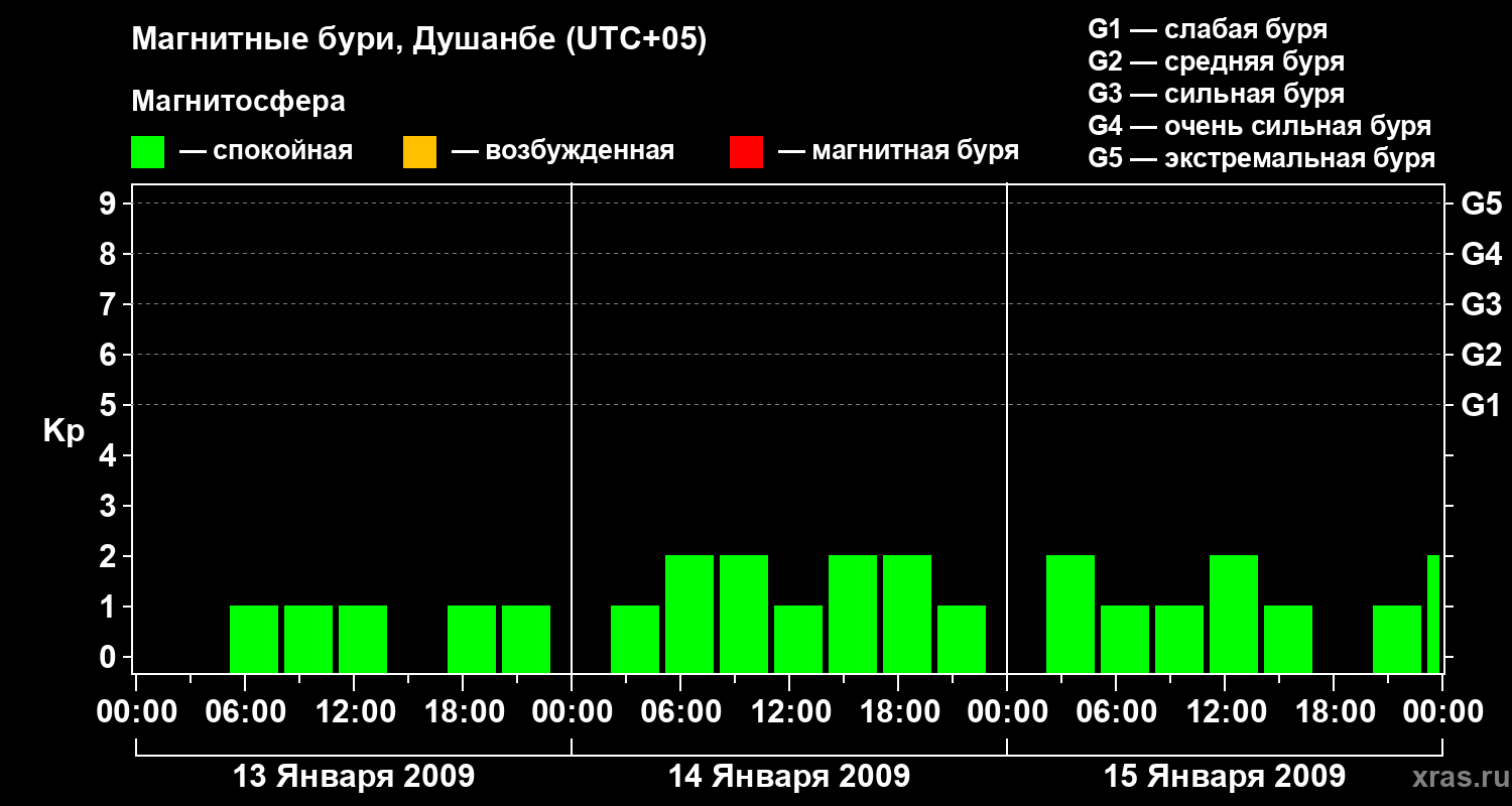 Изменения геомагнитного индекса Kp с 13 по 15 января 2009 года для средних широт