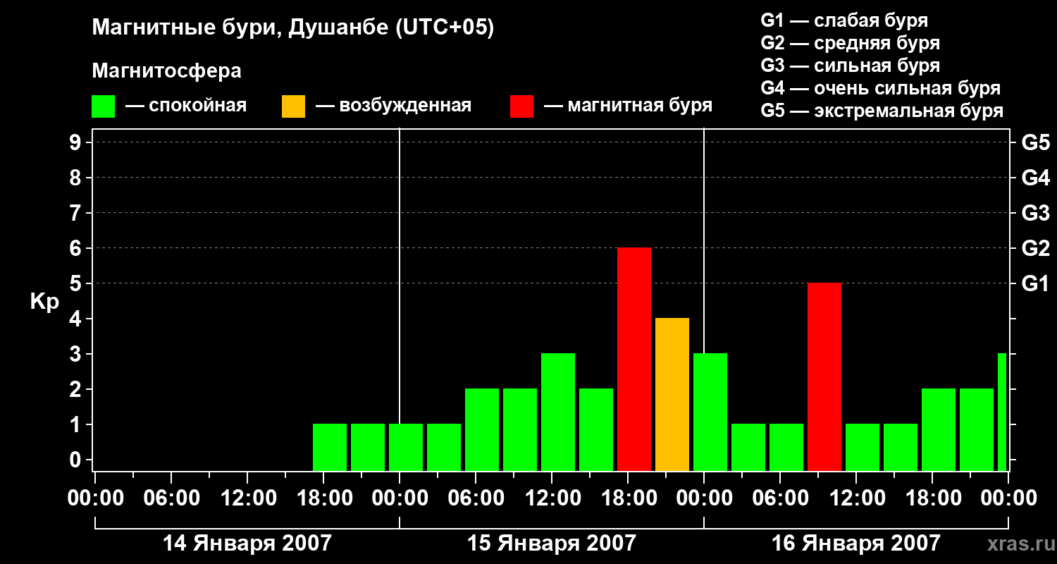 Изменения геомагнитного индекса Kp с 14 по 16 января 2007 года для средних широт