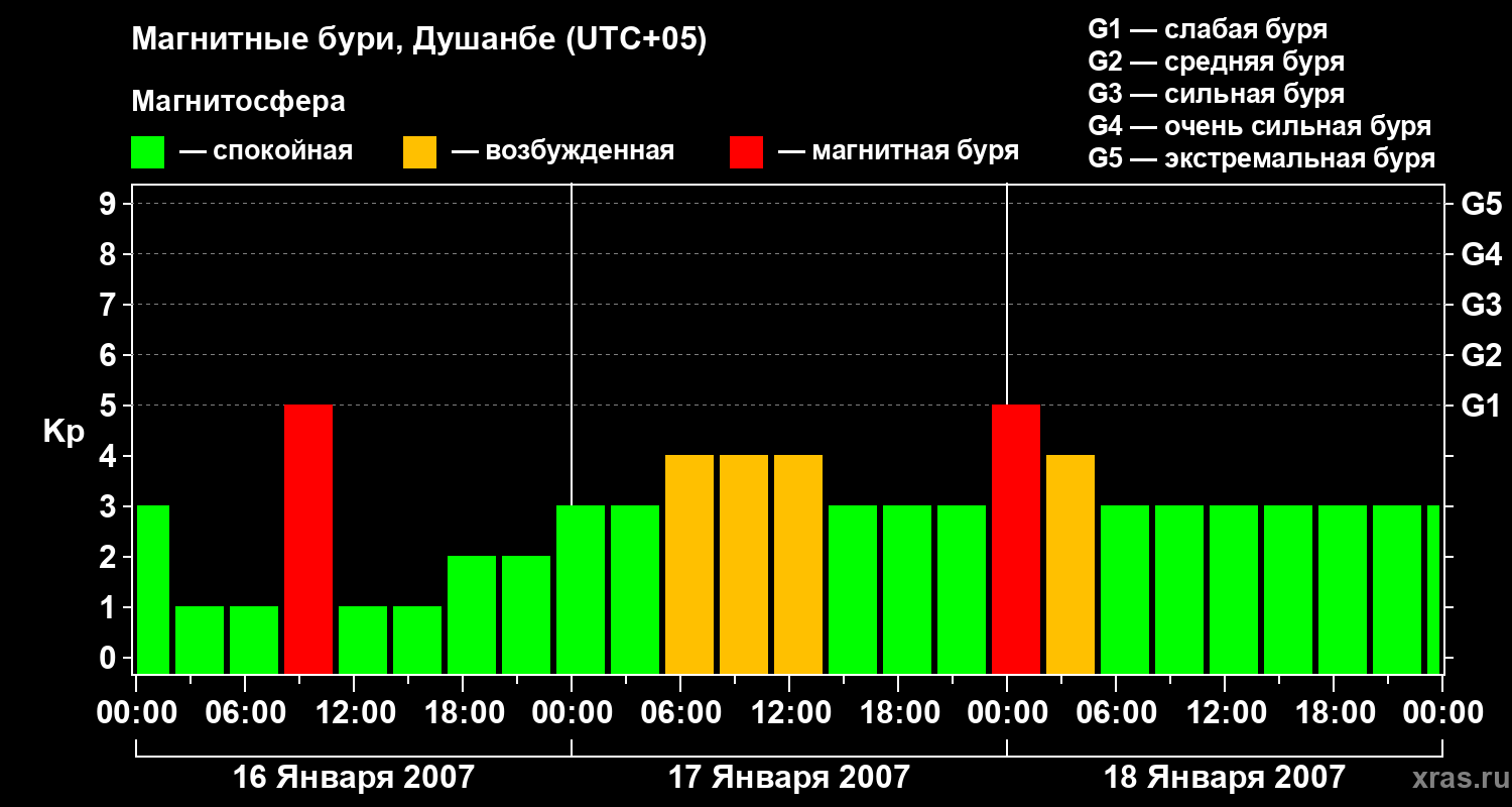 Изменения геомагнитного индекса Kp с 16 по 18 января 2007 года для средних широт