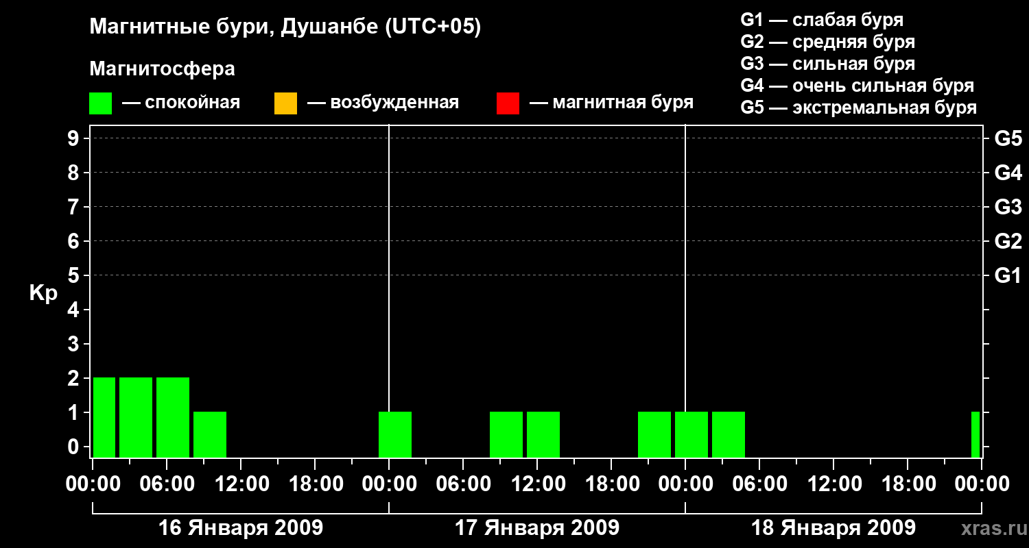 Изменения геомагнитного индекса Kp с 16 по 18 января 2009 года для средних широт