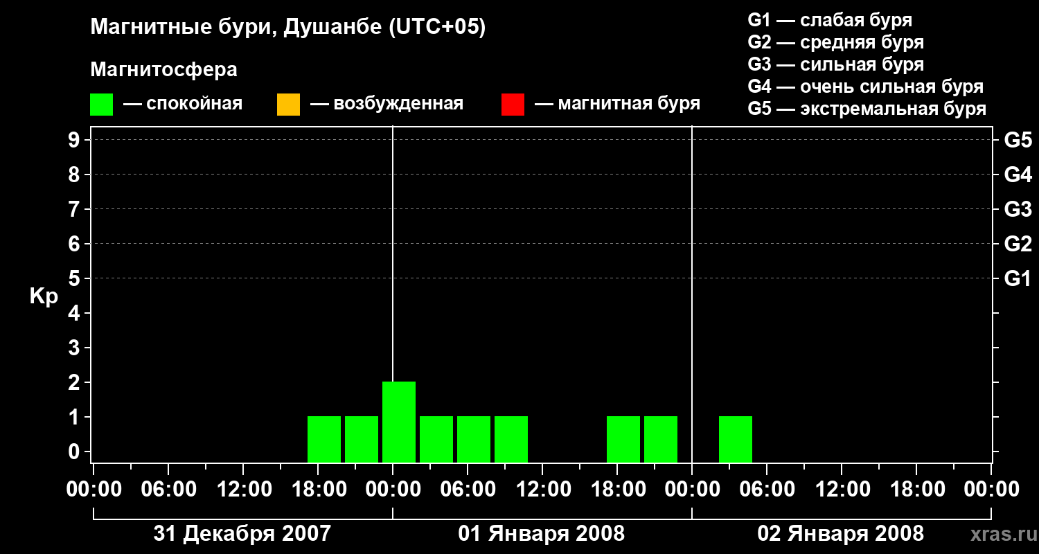 Изменения геомагнитного индекса Kp с 31 декабря 2007 года по 2 января 2008 года для средних широт