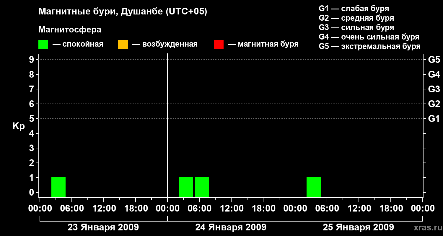 Изменения геомагнитного индекса Kp с 23 по 25 января 2009 года для средних широт