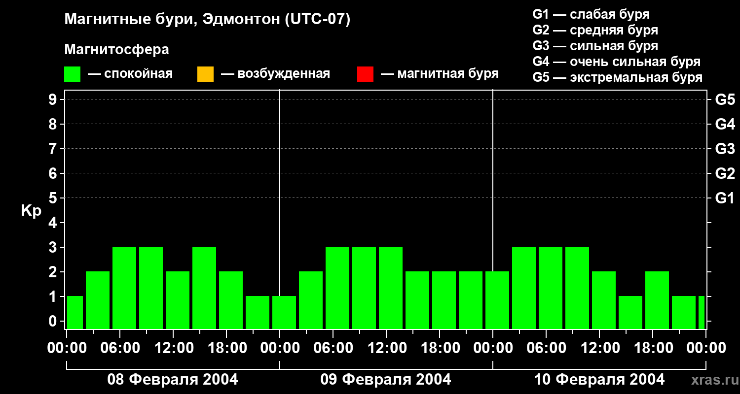 Изменения геомагнитного индекса Kp с 8 по 10 февраля 2004 года для средних широт