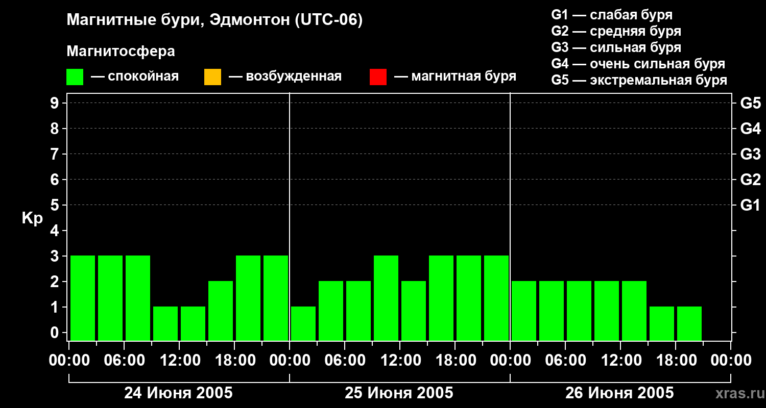 Изменения геомагнитного индекса Kp с 24 по 26 июня 2005 года для средних широт