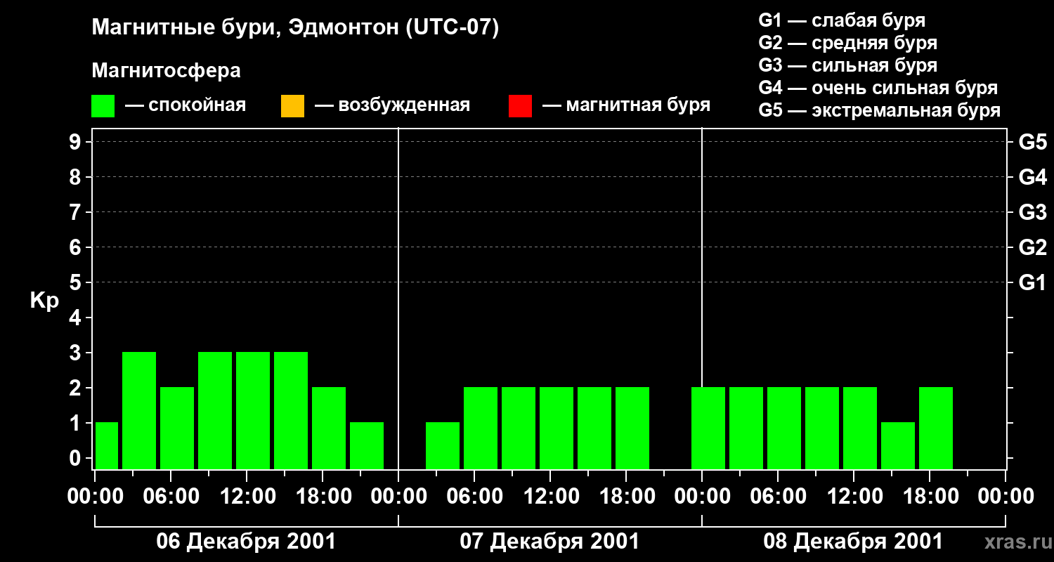 Изменения геомагнитного индекса Kp с 6 по 8 декабря 2001 года для средних широт