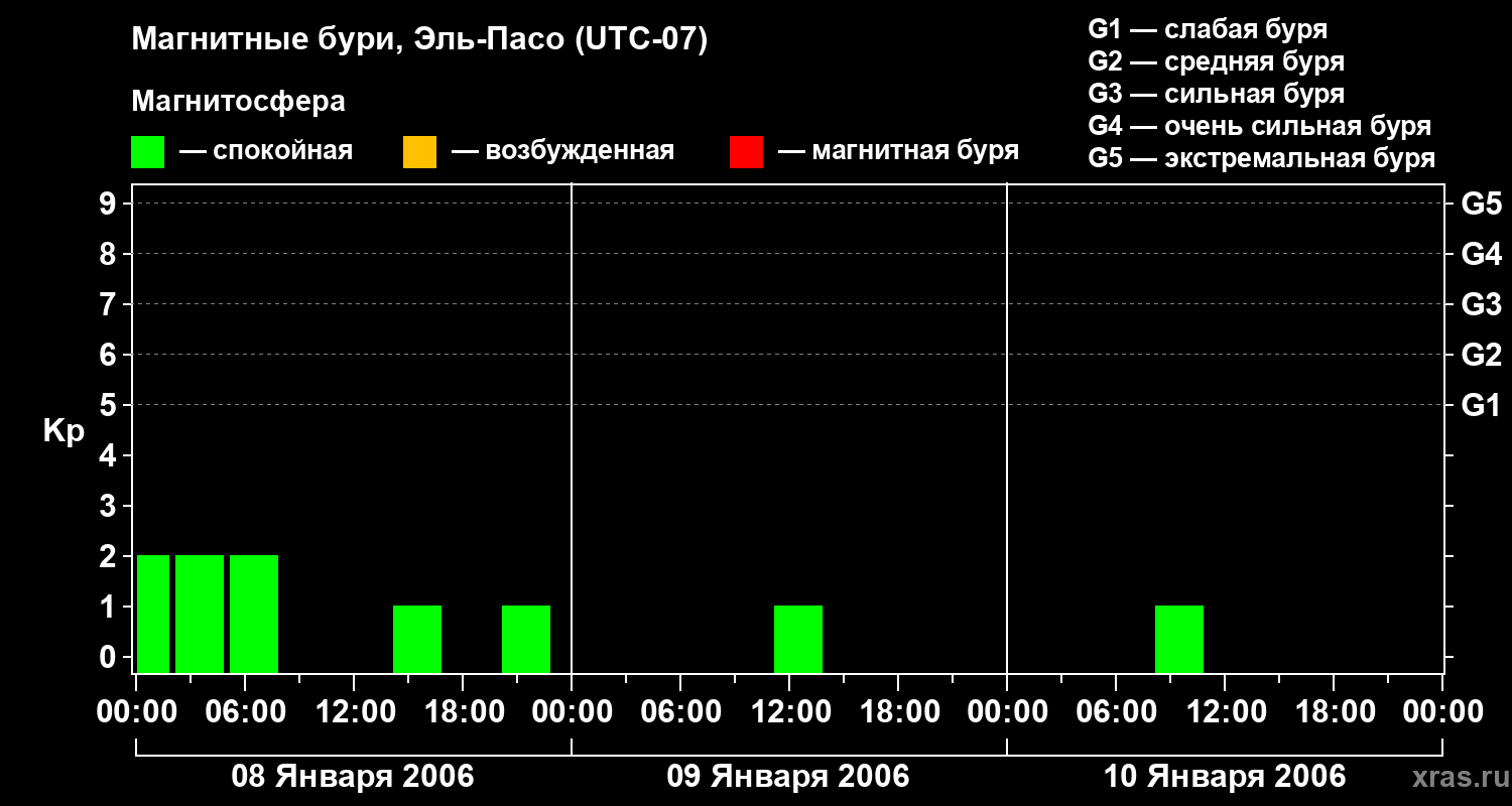 Изменения геомагнитного индекса Kp с 8 по 10 января 2006 года для средних широт