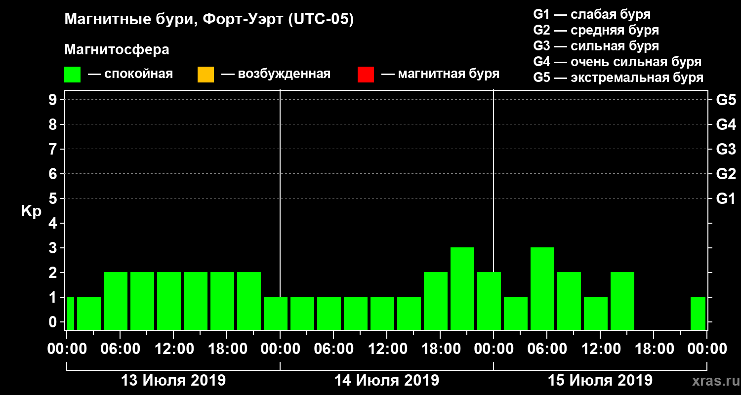 Изменения геомагнитного индекса Kp с 13 по 15 июля 2019 года для средних широт