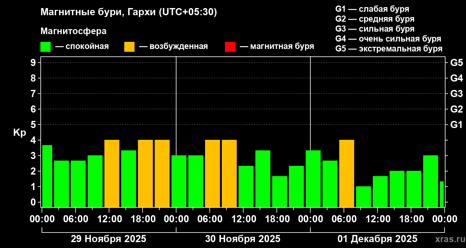 Изменения геомагнитного индекса Kp с 29 ноября по 1 декабря 2025 года для средних широт
