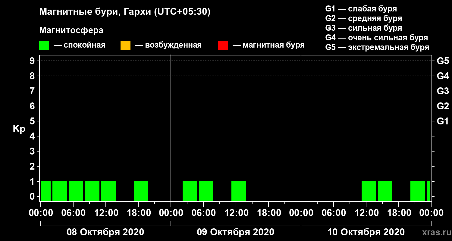 Изменения геомагнитного индекса Kp с 8 по 10 октября 2020 года для средних широт