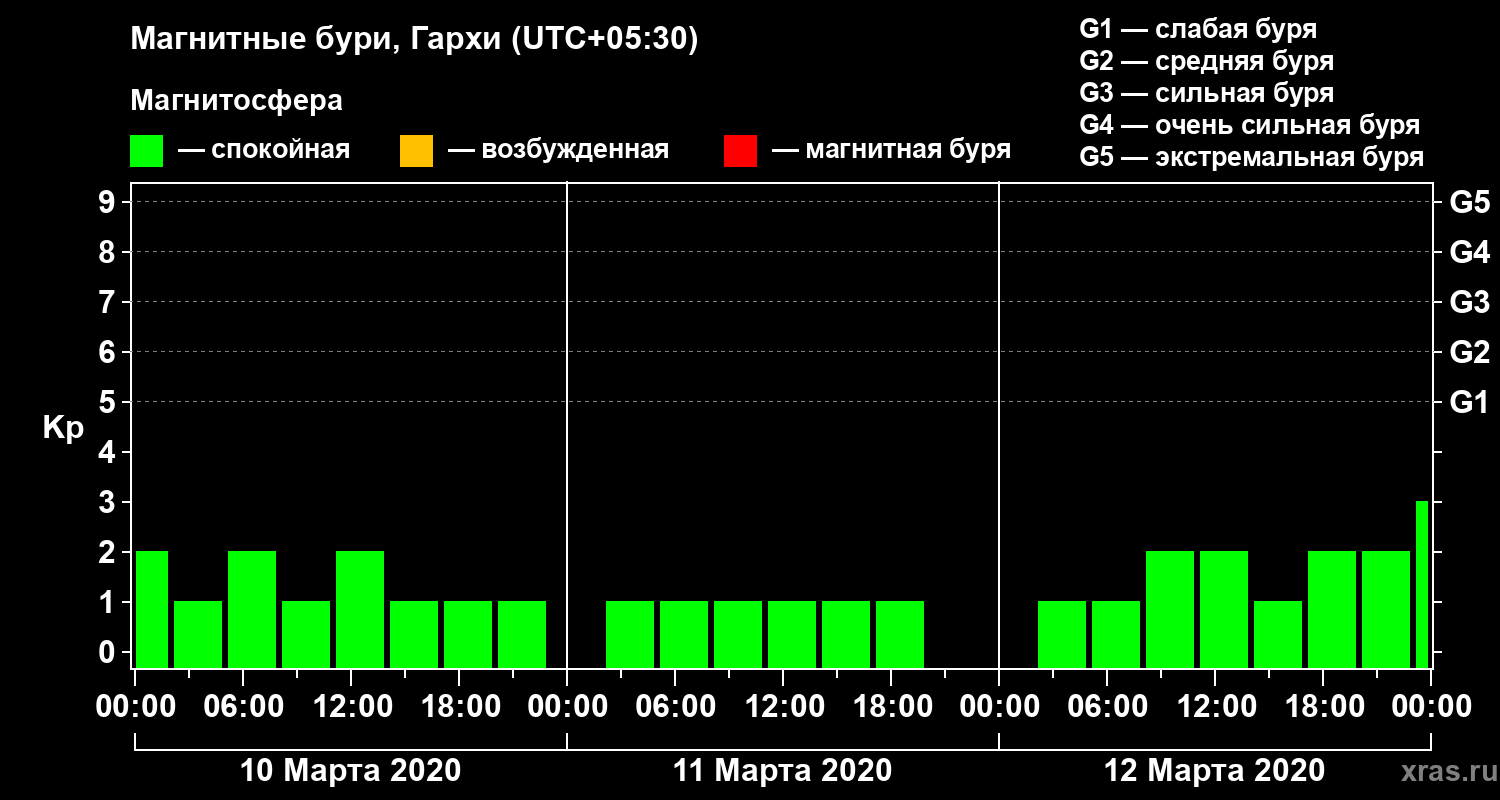 Изменения геомагнитного индекса Kp с 10 по 12 марта 2020 года для средних широт