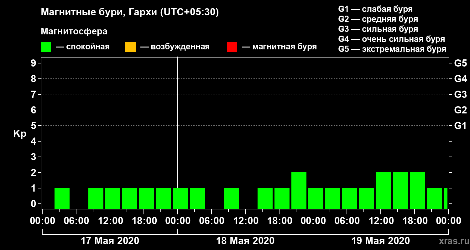 Изменения геомагнитного индекса Kp с 17 по 19 мая 2020 года для средних широт