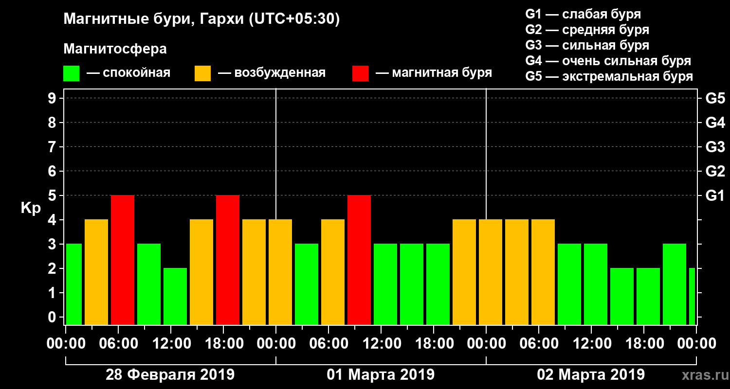 Изменения геомагнитного индекса Kp с 28 февраля по 2 марта 2019 года для средних широт
