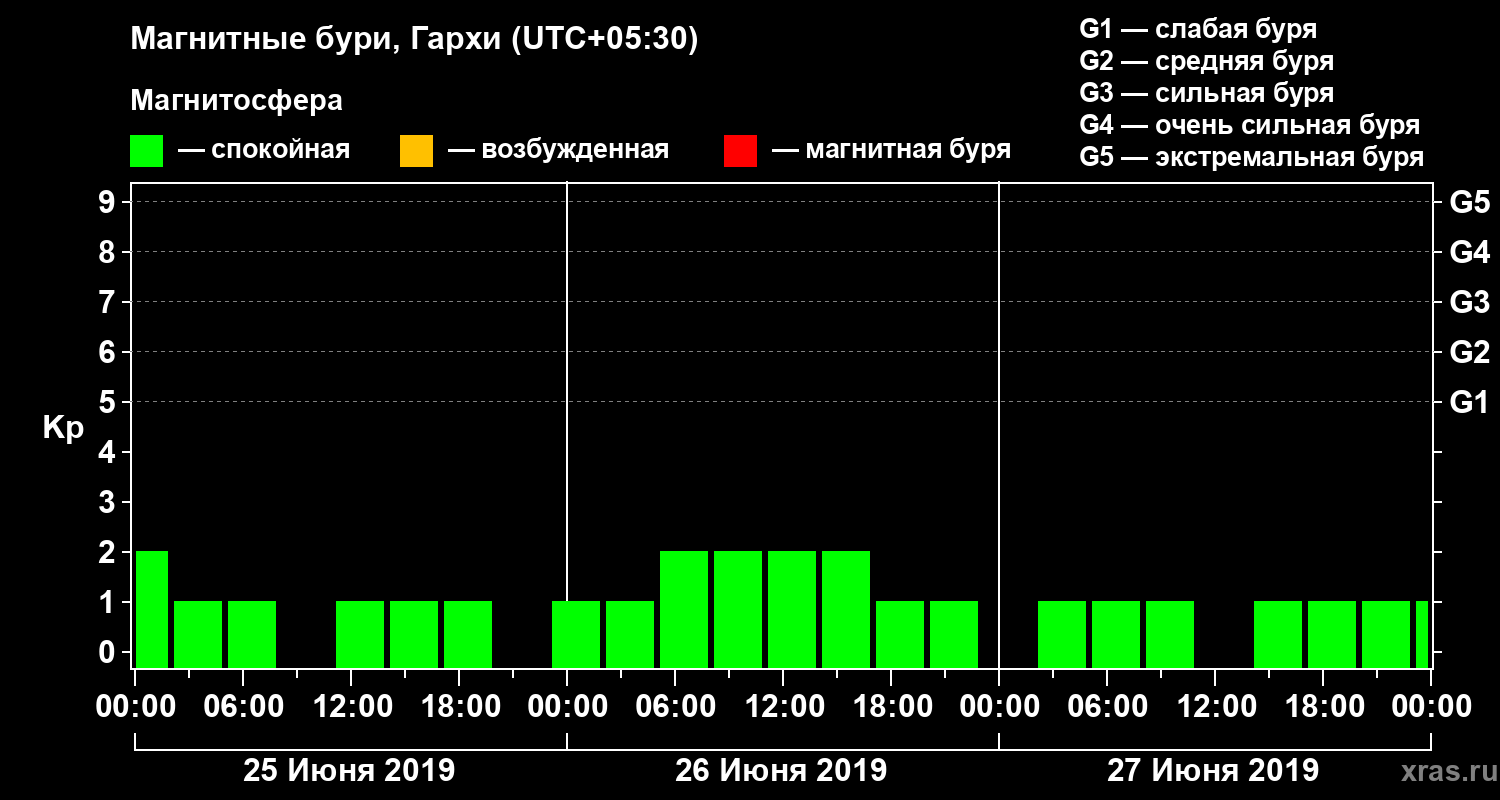 Изменения геомагнитного индекса Kp с 25 по 27 июня 2019 года для средних широт