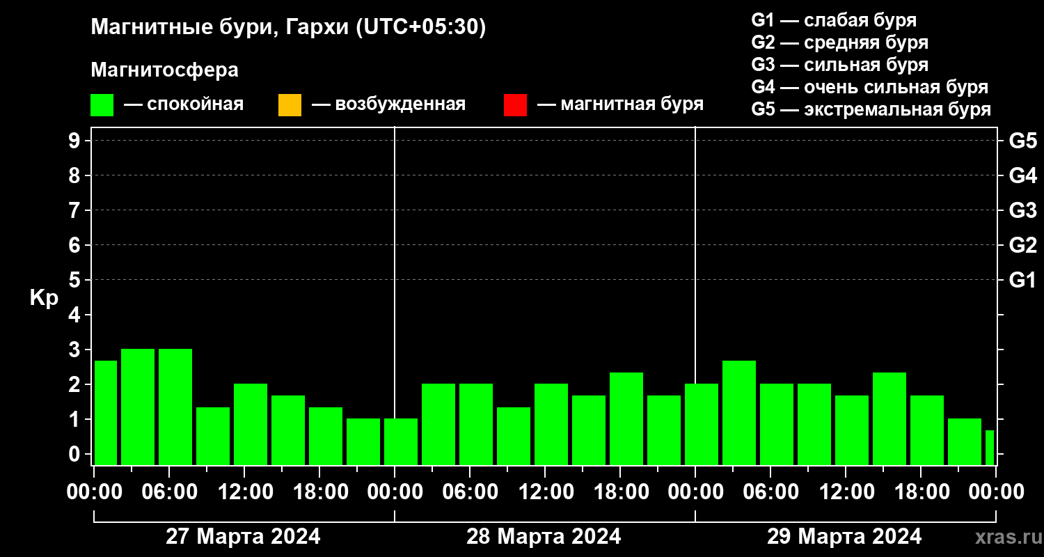 Изменения геомагнитного индекса Kp с 27 по 29 марта 2024 года для средних широт