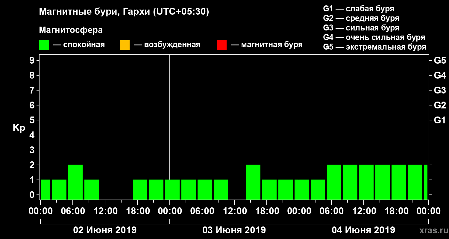 Изменения геомагнитного индекса Kp с 2 по 4 июня 2019 года для средних широт