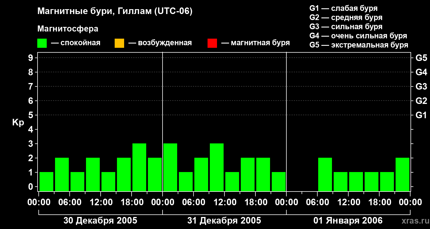 Изменения геомагнитного индекса Kp с 30 декабря 2005 года по 1 января 2006 года для средних широт